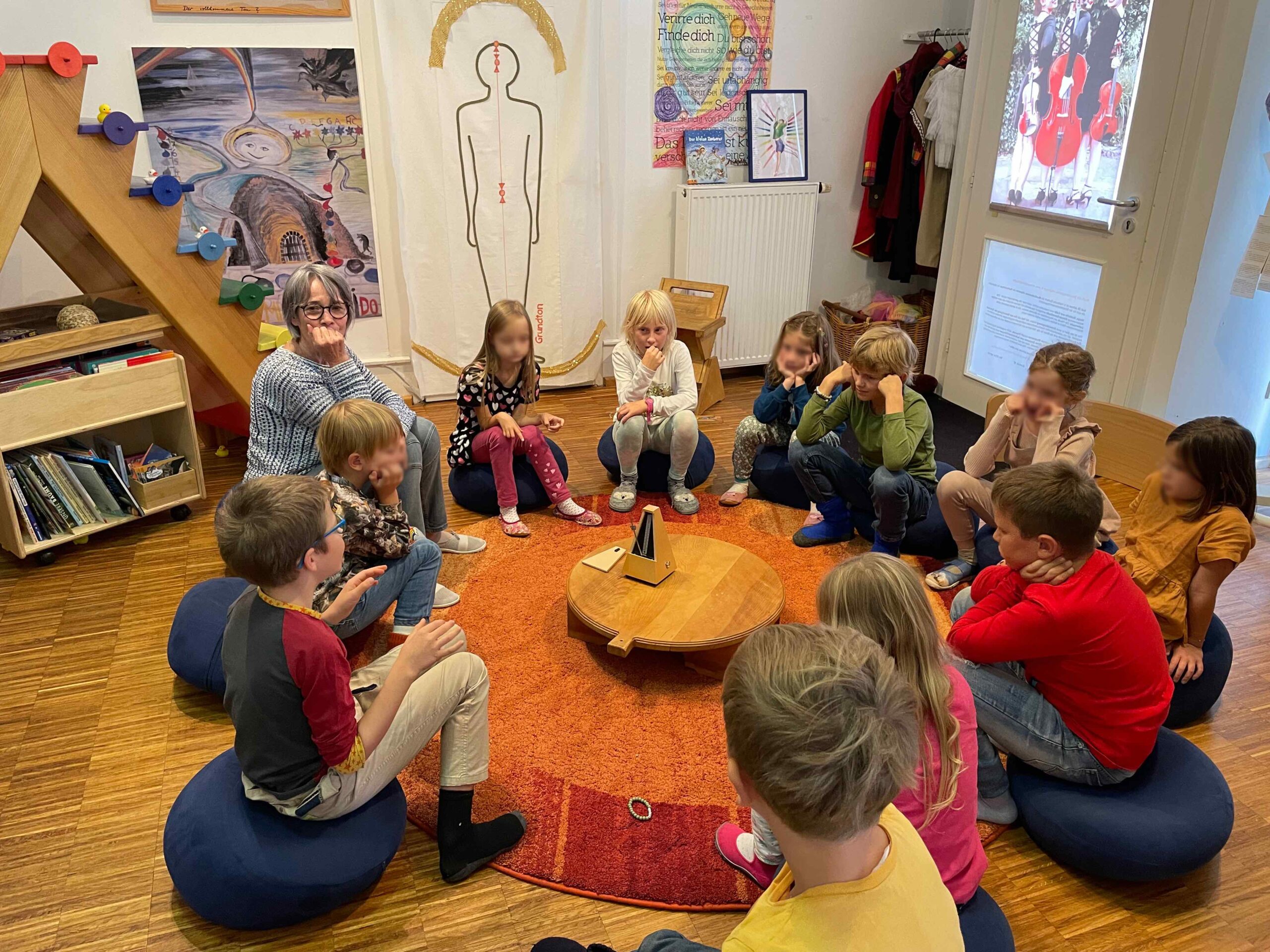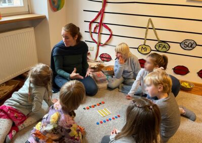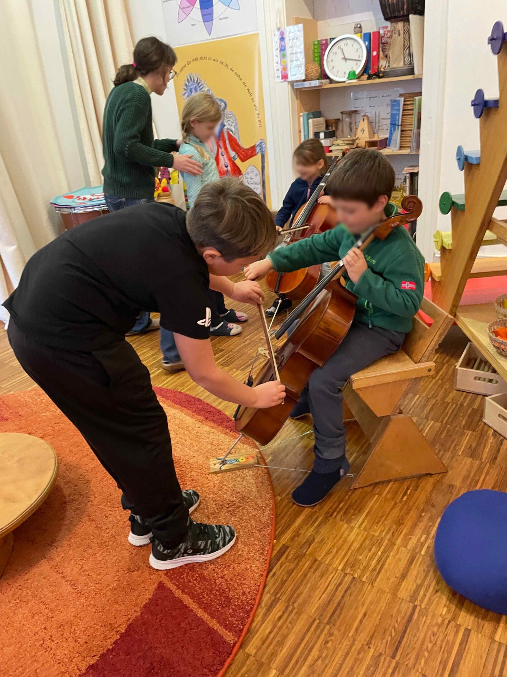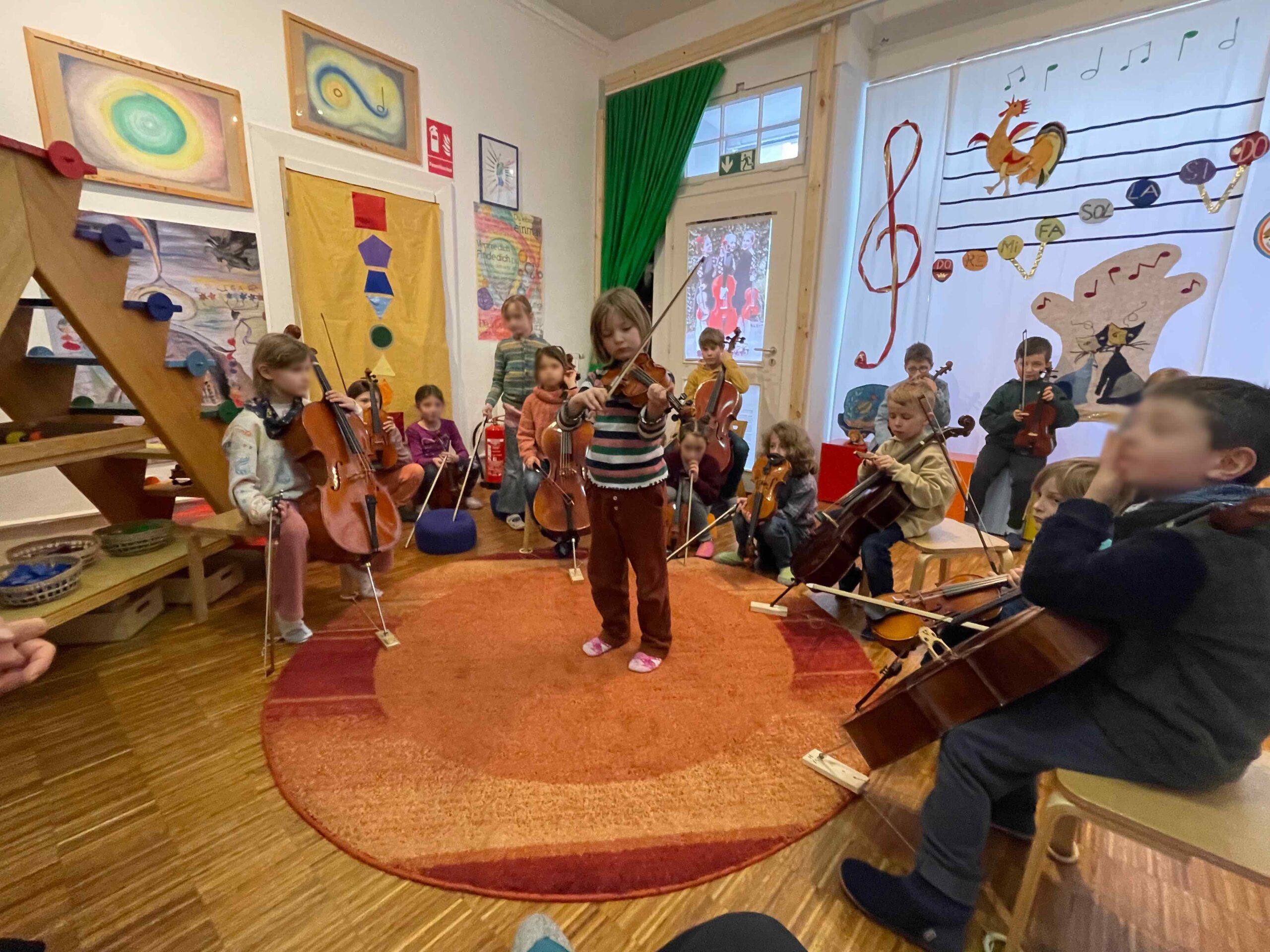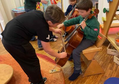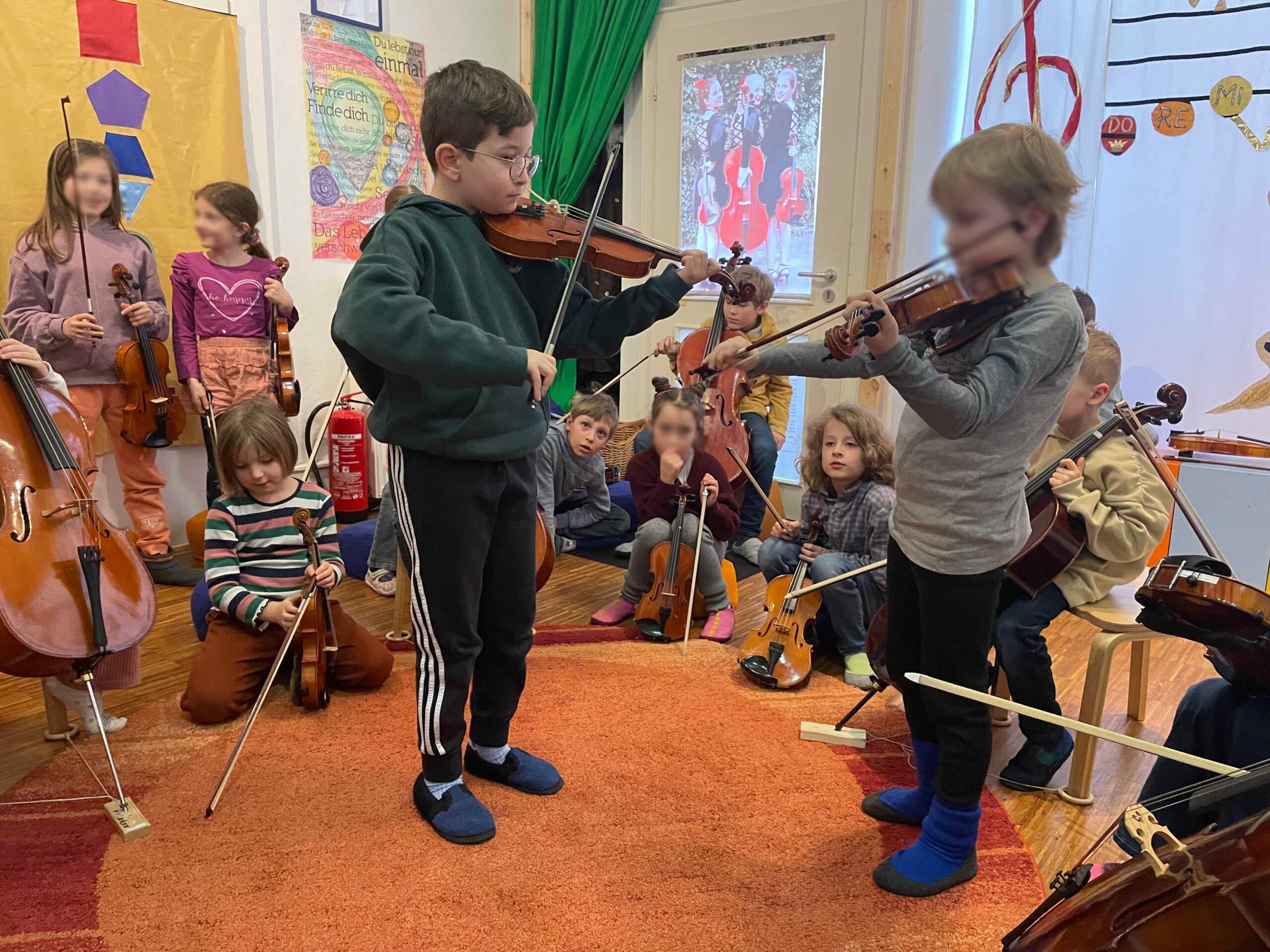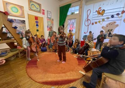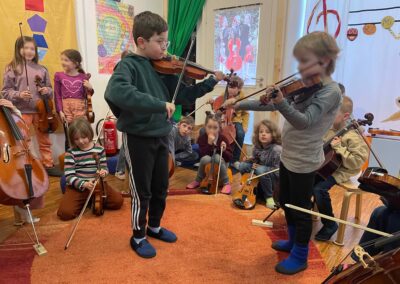 Musik begleitet uns im gesamten Schulalltag, und die Kinder werden spielerisch an die Instrumente herangeführt. Durch die gemeinsame Erfahrung entsteht eine schöne Gruppendynamik, die die Neugier auf das Instrument weckt. Die Freude und Begeisterung für das Instrument entwickeln sich meist ganz von selbst und bleiben bei keinem Kind aus. Manchmal braucht es etwas mehr Zeit – das ist vollkommen in Ordnung, und wir gehen einfühlsam darauf ein.