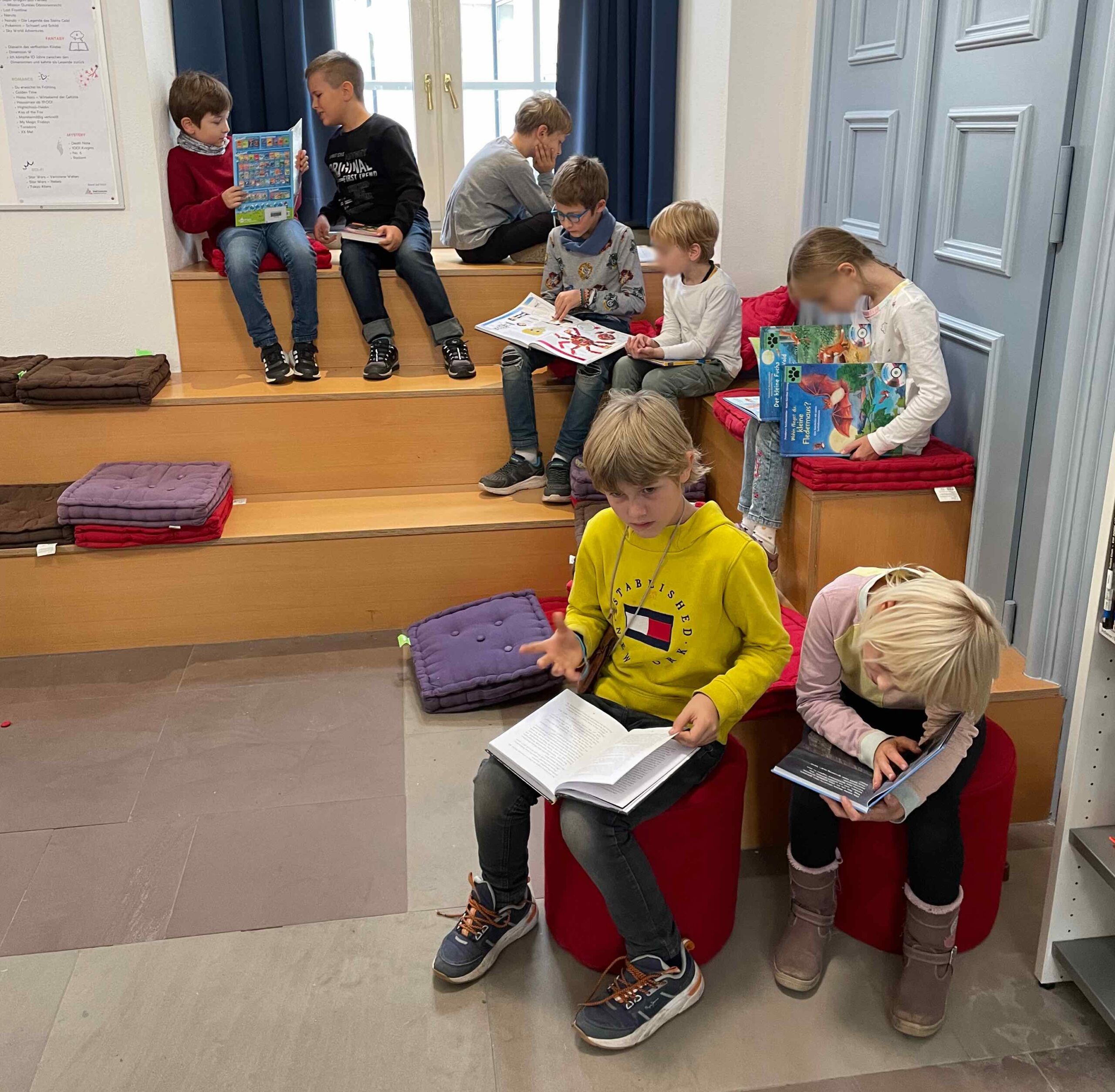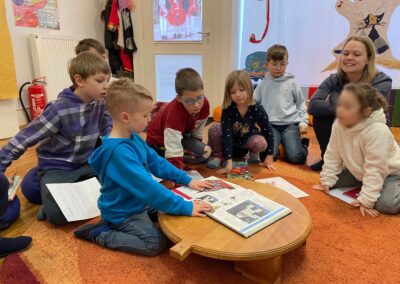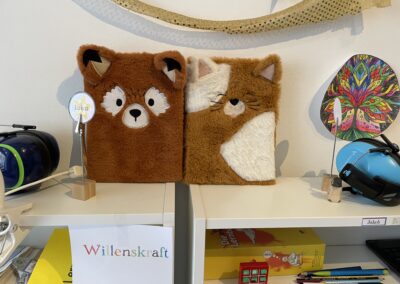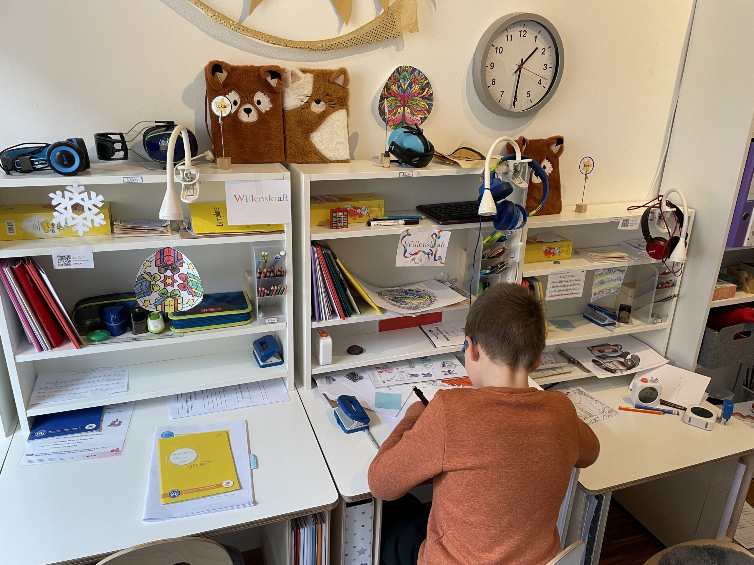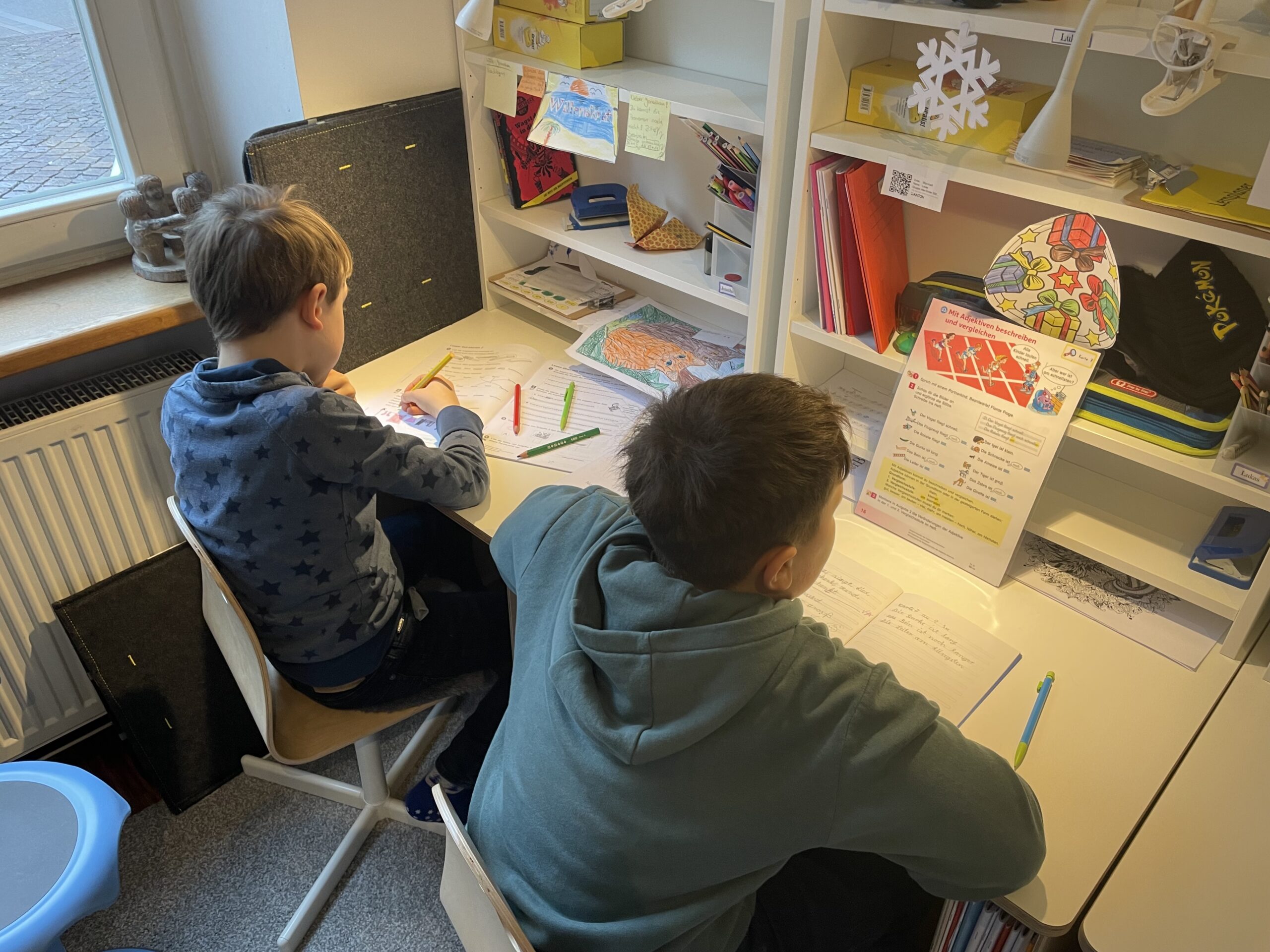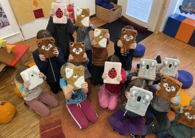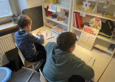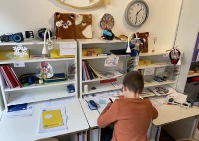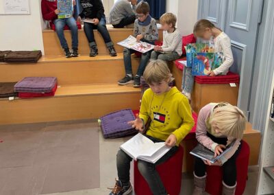 Leichter Schulalltag – Kein schwerer Schulranzen! Jedes Kind hat seinen eigenen Schreibtisch – mit allem, was es braucht. Auch über die Ferien geben wir keine klassischen Aufgaben, sondern jedes Kind sucht sich selbst ein Buch für die Ferienzeit in der Bibliothek aus, das Freude am Lesen weckt.
