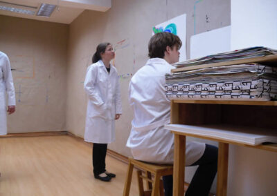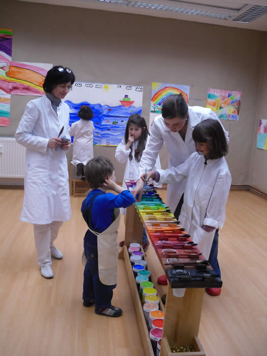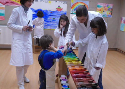 Eröffnet wird die Malstunde mit dem Anlegen der Kittel. Das hat weniger den Grund, sich gegen Farbflecken zu schützen – was selbst den kleinsten Kindern nur selten passiert – als vielmehr ein Ritual zu ermöglichen, das hilft, durch das Andersaussehen und damit Anderssein die Außenwelt hinter sich zu lassen