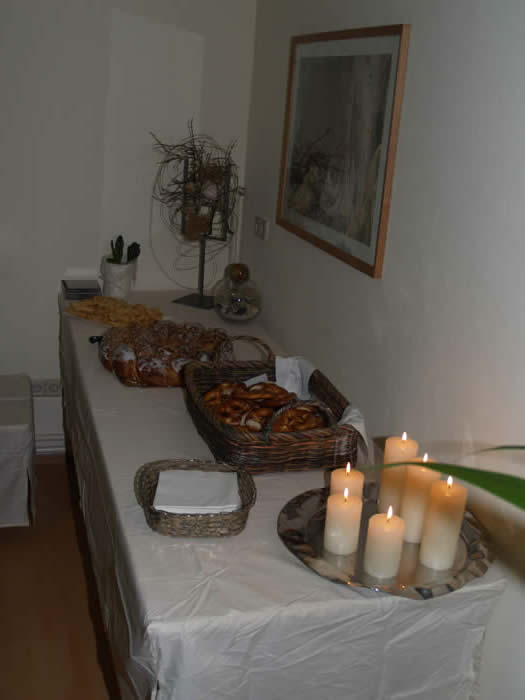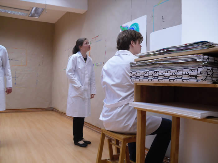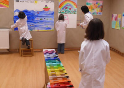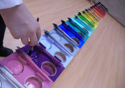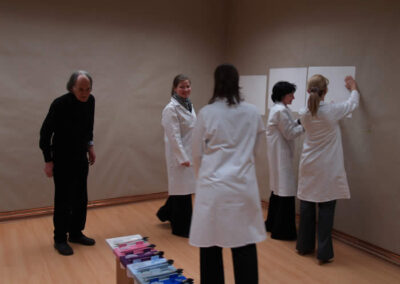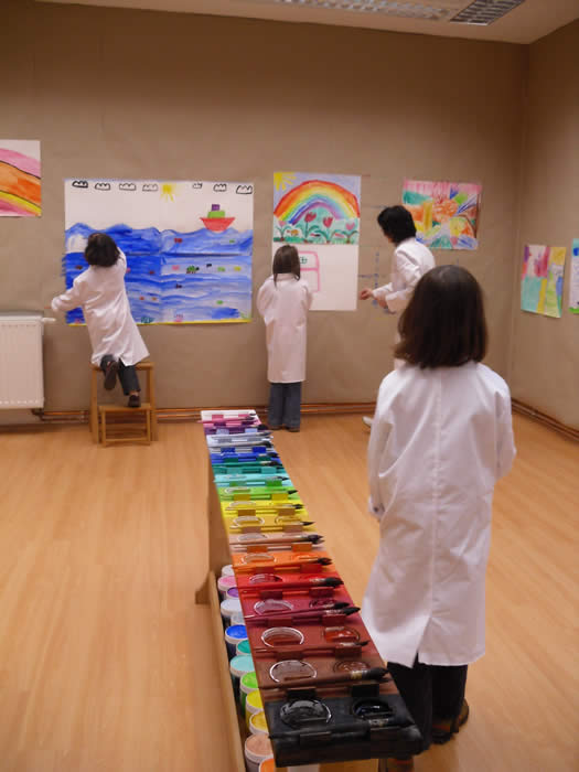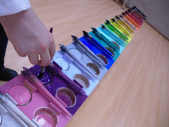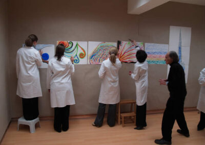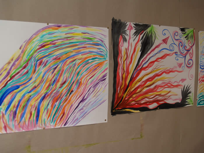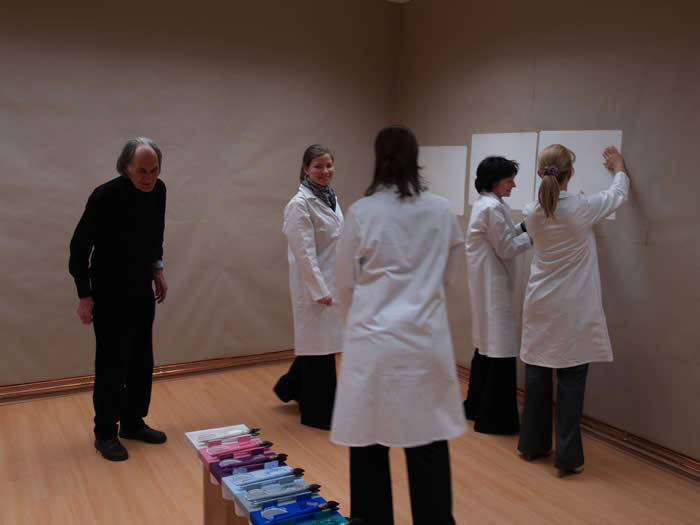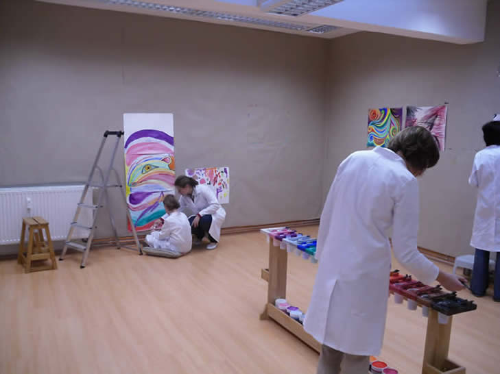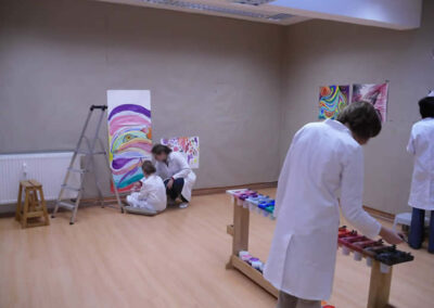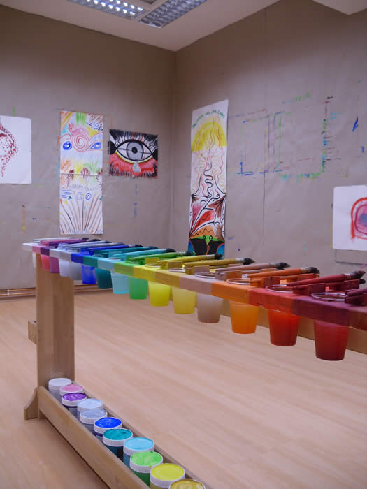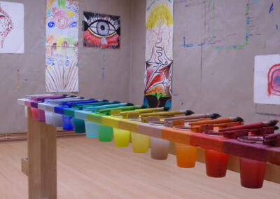 In der Mitte des Raumes befindet sich ein großer Palettentisch mit 18 leuchtenden Farben. Es sind besondere Farben, die dafür geeignet sind, mit ihnen an senkrechten Flächen zu malen, ohne dass Tropfen entstehen müssen. Jeder kann sich neben seinen Malgefährten ausbreiten und nach seinem Bedürfnis den eigenen Raum in alle Richtungen erweitern. Die wundervollen Fehhaarpinsel sind spitz, aber saugfähig, um viel Wasser und Farbe aufnehmen zu können. Die Wände aus Packpapier erfahren zunehmend unzählige Pinselstriche, die über die Blattränder hinausgehen, und das so entstehende Muster führt den Raum allmählich in eine ganz besondere Stimmung.