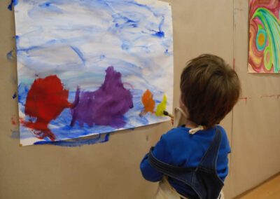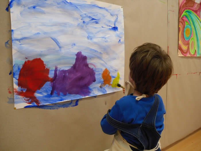 Das Papier wird durch jeden selbständig an die Stelle der Wand gebracht, wo der Raum für das eigene Spiel angenehm erscheint. Es kann viel Zeit vergehen, bis man sich entschieden hat, in welche Farbe des großen Palettentisches man zuerst den Pinsel taucht. Mit dem Pendeln zwischen dem Blatt an der Wand und prächtigen Farben entsteht die persönliche Spur, die der eigenen Welt entspringt. So können die Malenden entsprechend ihrem individuellen Maß Erfahrungen sammeln und verarbeiten, ohne allein zu sein. Mit zunehmender Zeit, geht die innere Anspannung verloren und das Bedürfnis, die Spur frei fließen zu lassen, verstärkt sich. Bei kleinen Kindern sieht man, dass unendliche Wiederholungen das für sie Wesentliche ans Licht bringt. Die Lust an der Wiedergabe, ohne zu fragen: „warum“, bezeichnet Stern als einen Rauschzustand in Geistesgegenwart. Entgegen der häufig eingeprägten Gewohnheit, die Kinder von den Erwachsenen zu trennen, ist das Malspiel für Groß und Klein gleichzeitig miteinander möglich, in Sicherheit und Geborgenheit, in der sich durch hingebungsvolles Tun eine hohe Konzentrationsfähigkeit entwickelt. Mit dem Malspiel wird schon sehr früh eine Möglichkeit geschaffen, den inneren Frieden zu erhalten, der die Basis unseres persönlichen Glückes ist.